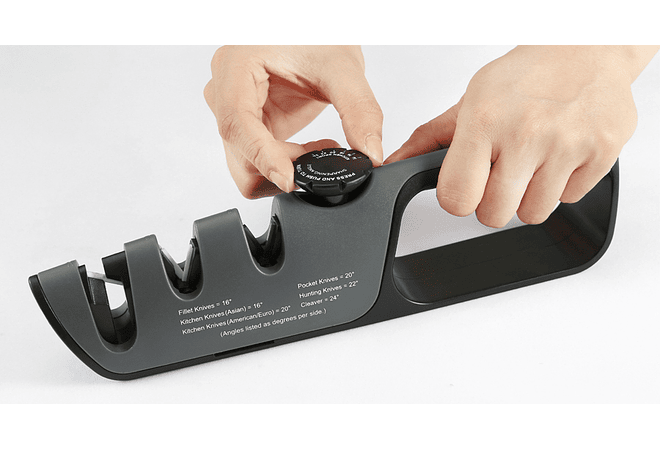 3. Dos ranuras de afilado manual ajustables, la perilla de fácil ajuste permite afilar en una amplia gama de ángulos (14 grados/lado a 24 grados/lado)