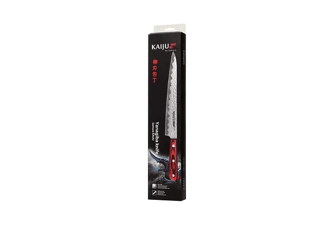 El Cuchillo Yanagiba de la línea KAIJU de Samura se inspira en las míticas criaturas de la cultura japonesa. Esta colección está diseñada uniendo funcionalidad y estilo. Su hoja martillada de acero de una sola capa no solo le da una estética única, similar a la superficie lunar, sino que también crea pequeñas depresiones antiadherentes, facilitando cortes fluidos y precisos. Su mango de pakka wood, material sintético que se elabora alternando finas capas de madera natural y de resina, ofrece gran resistencia al calor, la humedad, los golpes y las manchas, conservando la belleza natural de la veta de la madera.