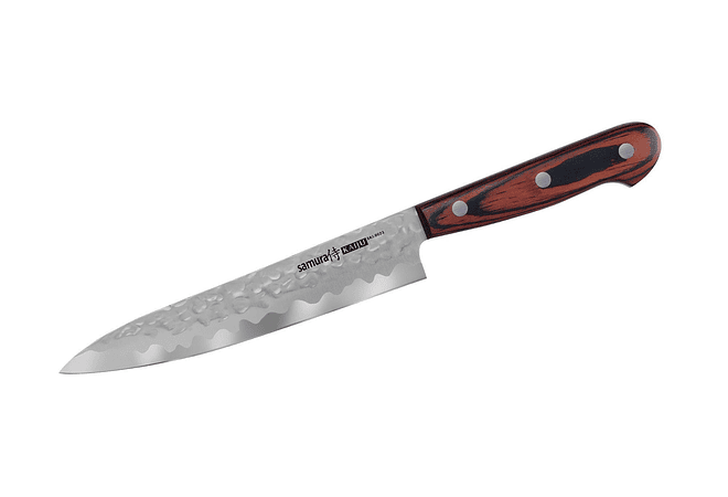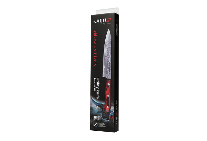El cuchillo de cocina universal de 150 mm de la colección Samura Kaiju complace a su propietario con la longitud óptima de la hoja endurecida a 58 HRC, perfectamente equilibrada con un mango ergonómico de madera estabilizada.