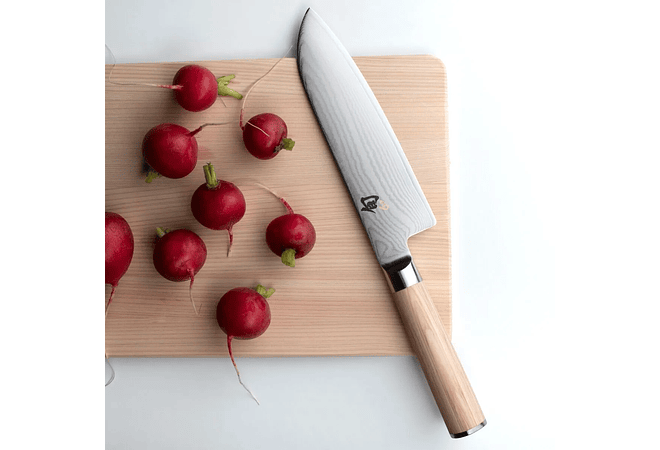 Al igual que un cuchillo de chef, el santoku japonés es un cuchillo multiusos que se utiliza para casi todos los trabajos de corte en la cocina. Ligeramente más corto que el cuchillo de chef estándar, un santoku es muy fácil de maniobrar, incluso en una cocina más pequeña. El Shun Classic Blonde Santoku tiene la curva del vientre suficiente para permitir cortes oscilantes, lo que mejora la versatilidad multifunción del cuchillo. Esta distintiva pieza de cubertería de cocina funciona a la perfección y descubrirá que los nuevos mangos rubios de Pakkawood se adaptan a su mano como un cómodo guante.