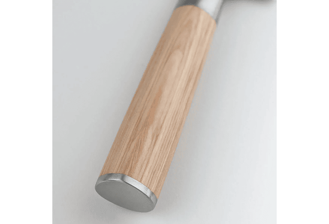 -34 capas de revestimiento de Damasco inoxidable en cada lado (68 en total); Apoya el núcleo, añade resistencia a las manchas y ayuda a que los alimentos se liberen de la hoja.