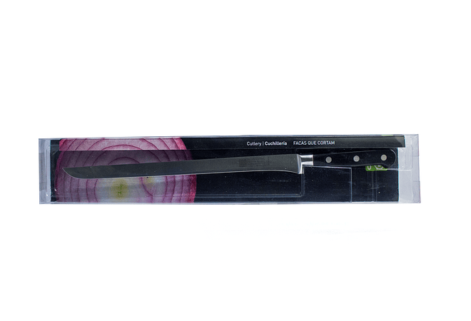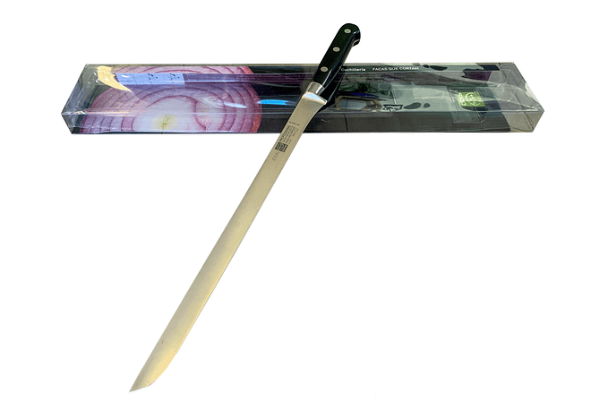 Cuchillo largo y delgado, con hoja flexible y filo liso. Especial para cortar jamón y otras piezas grandes de carne.